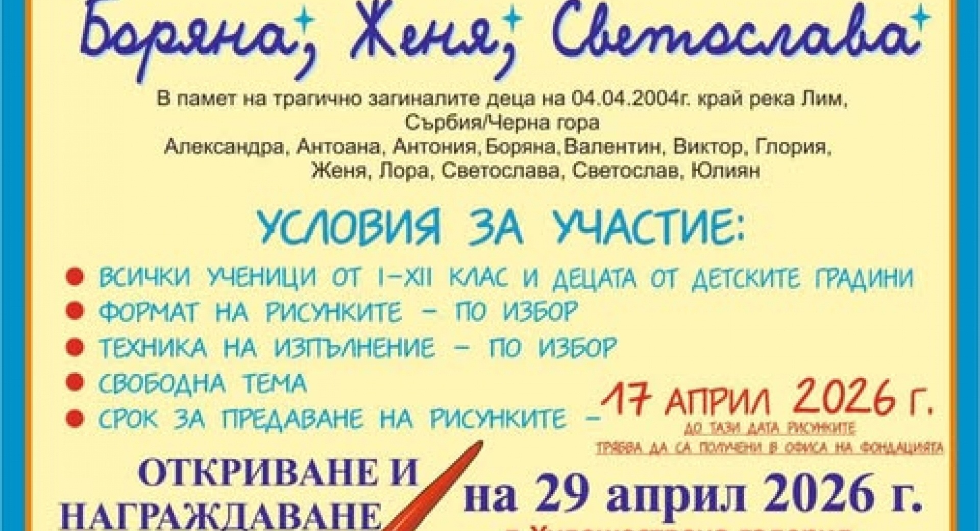 XXI-ви конкурс-изложба за детска рисунка "Три звездички" Боряна, Женя, Станислава. Срок за предаване на рисунките - 17.04.2026 г. Откриване и награждаване на 29.04.2026г. …