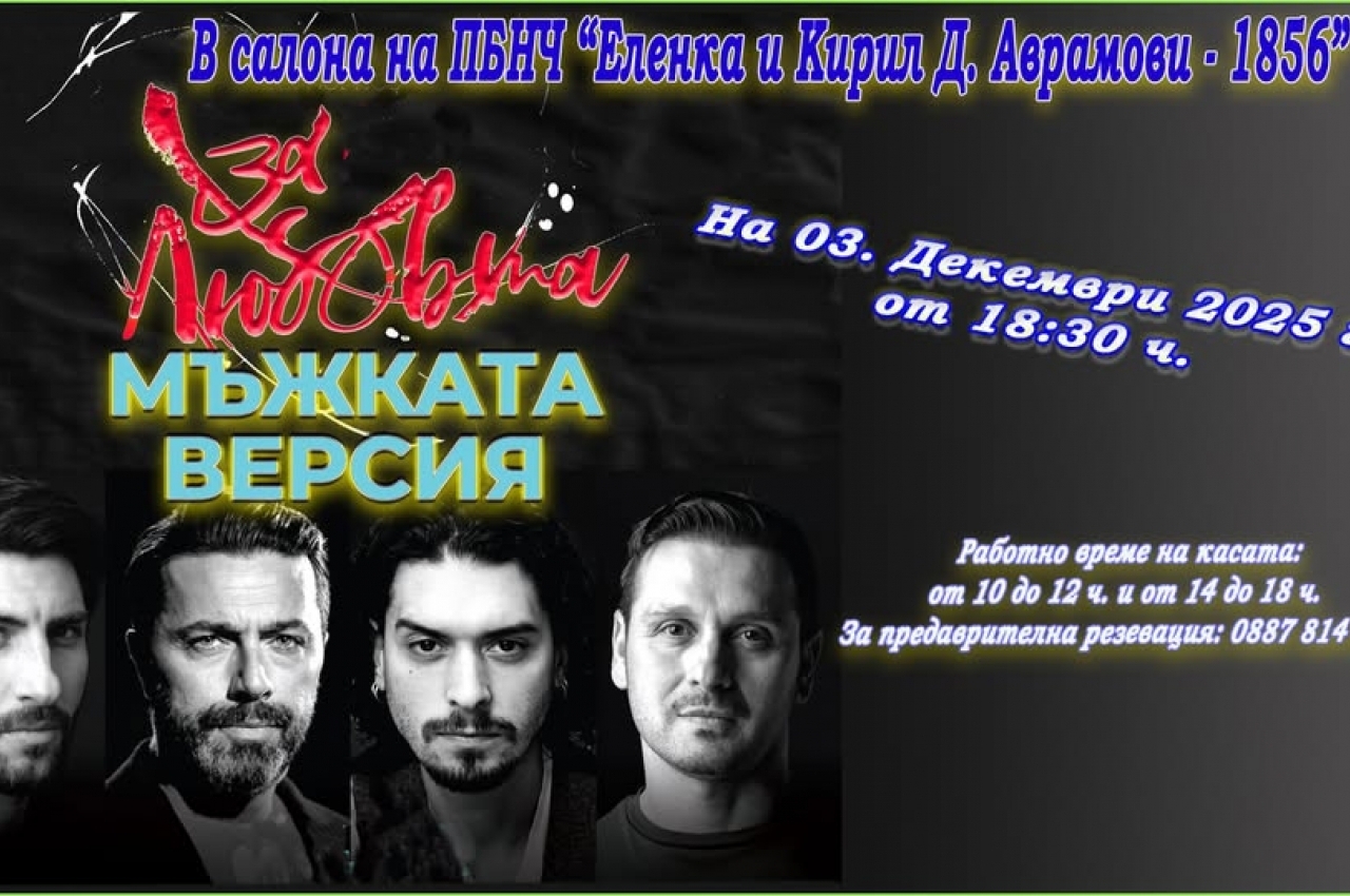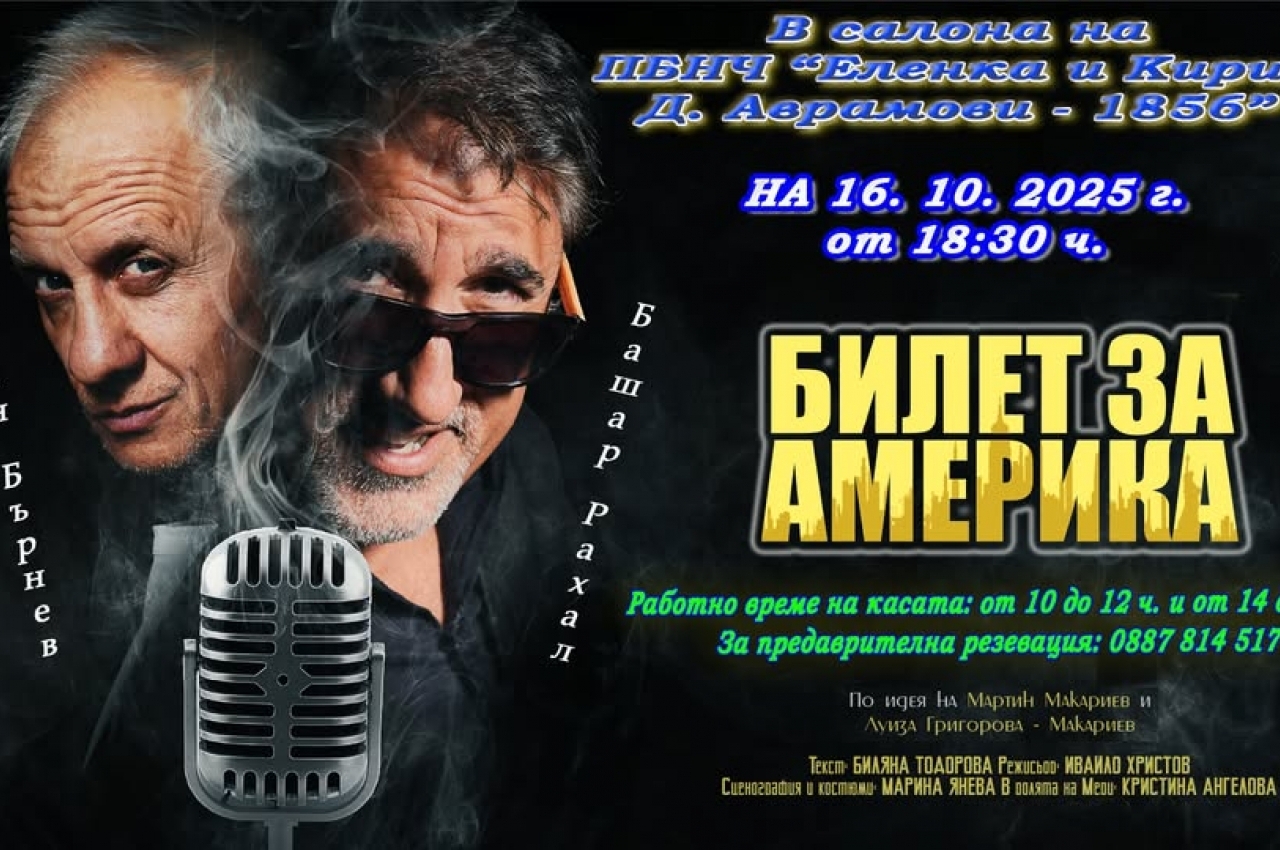 В салона на ПБНЧ "Еленка и Кирил Д.Аврамови -1856" на 16.10.2025 г. от 18,30 часа щу су играе постановката: "Билет за Америка" с участието на Иван Бърнев и Башар Рахал. Билети…