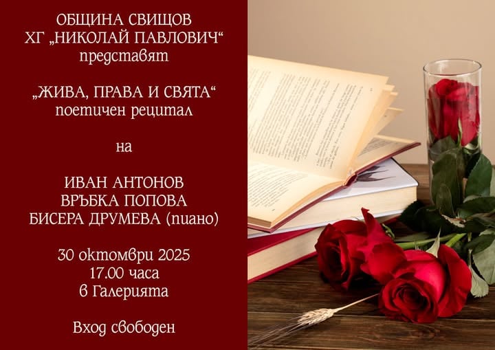 Заповядайте на поетичен рецитал "Жива, права и свята" в ХГ "Н.Павлович" на 30.10.2025 г. от 17.00 ч. Вход свободен.