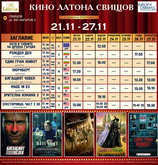 Програмата за петък, 21.11, е изпълнена с премиерни заглавия! Изберете сред новия филм на Стефан Командарев - MADE IN EU; НЮРНБЕРГ с Ръсел Кроу; ЗЛОСТОРНИЦА 2 с Ариана Гранде или БЯГАЩИЯТ ЧОВЕК по Стивън Кинг и още много други!