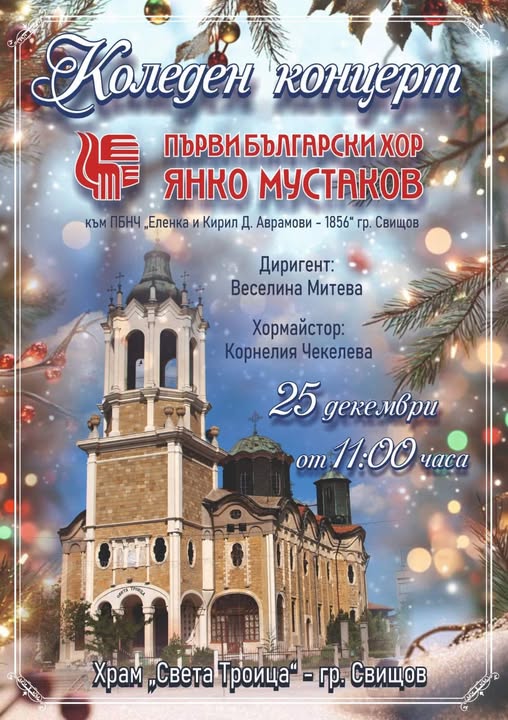 Заповядайте на Коледен концерт на Първи български хор "Янко Мустаков" на 25 декември 2025 година от 11:00 часа в Храм "Света Троица" в Свищов!