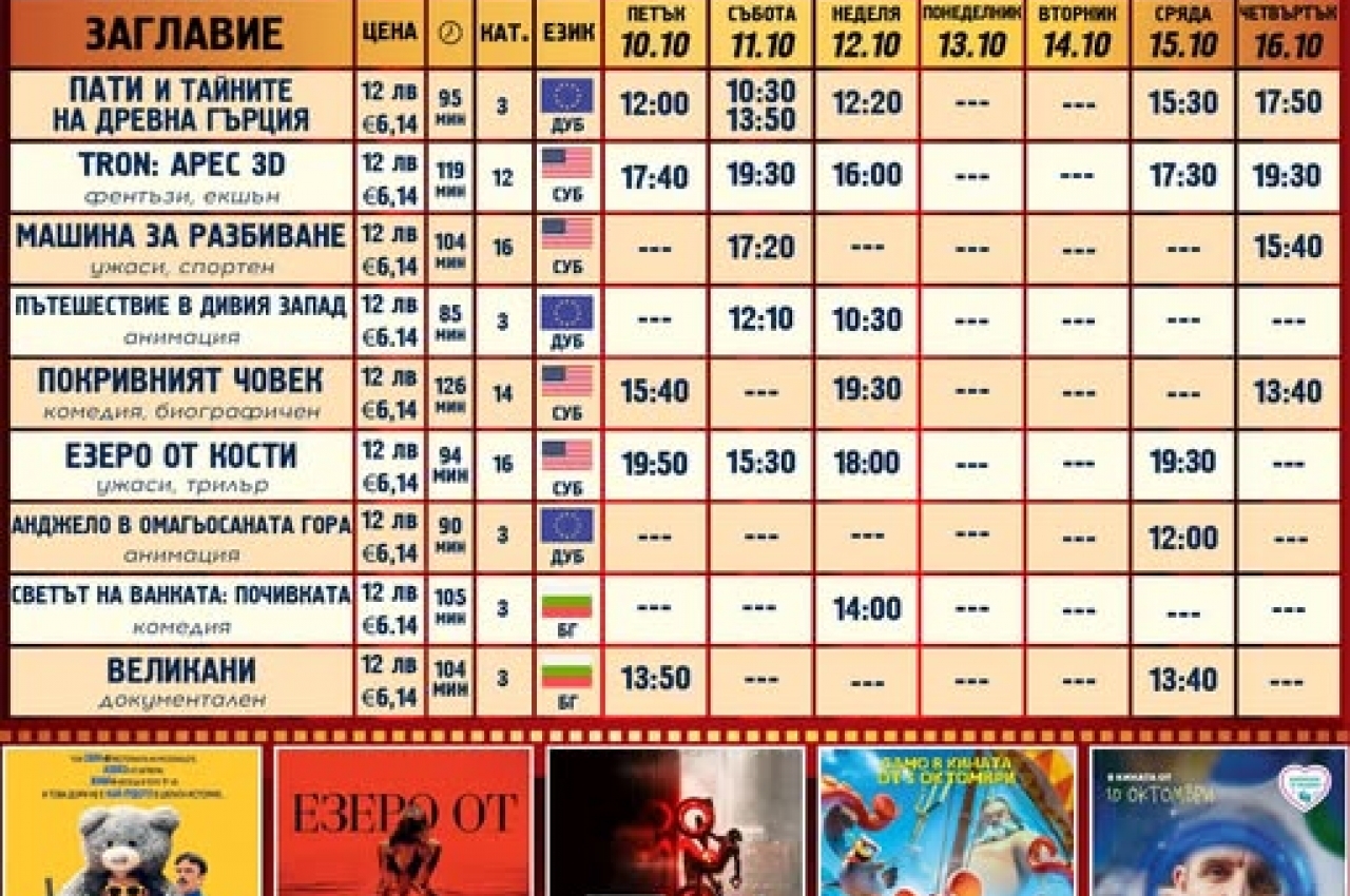 Сред новите премиерни заглавия от петък, 10.10, са фантастичният екшън с Джаред Лето "TRON: Арес 3D"; комедията по истински случай с Чанинг Тейтъм "ПОКРИВНИЯТ ЧОВЕК"; трилърът…