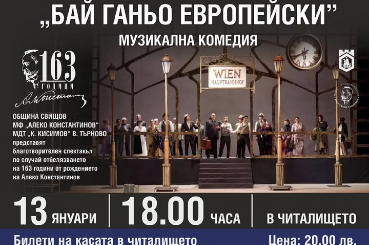 „БАЙ ГАНЬО ЕВРОПЕЙСКИ“ музикална комедия по случай честването на 163 години от рождението на Алеко Константинов 13 януари / 18.00 часа / в салона на ПБНЧ – гр. Свищов Билети…