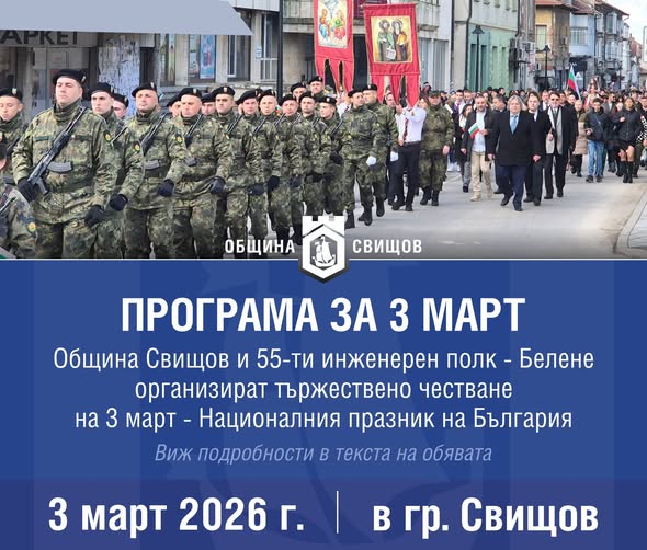 - Общоградско поклонение. Ритуал за полагане на венци и цветя в памет на загиналите за Освобождението на България. Участват: 55-ти Инженерен полк – гр. Белене и деца от ДГ „Васил Левски“.
